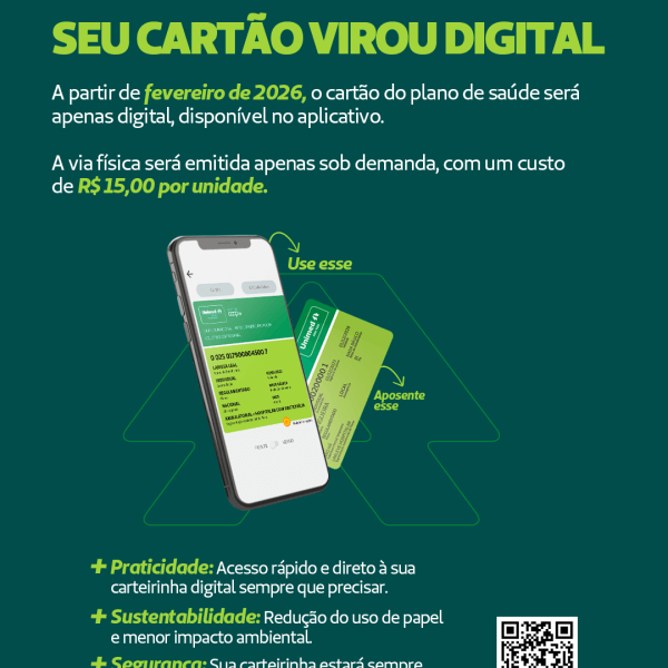 A carteirinha física ficou no passado. Agora, o cartão do plano de saúde da sua empresa é exclusivamente digital através do App Unimed. Essa mudança garante mais agilidade, segurança, sustentabilidade…