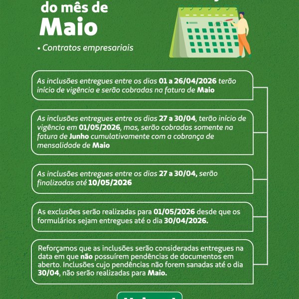 Consulte aqui o Calendário de Movimentações do mês de Maio.