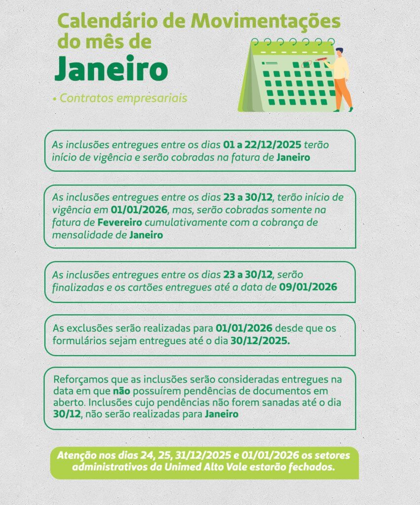 Consulte aqui o Calendário de Movimentações do mês de Janeiro.