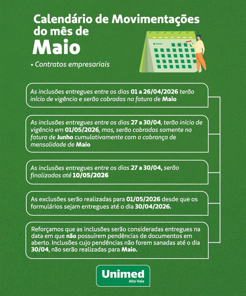 Consulte aqui o Calendário de Movimentações do mês de Maio.